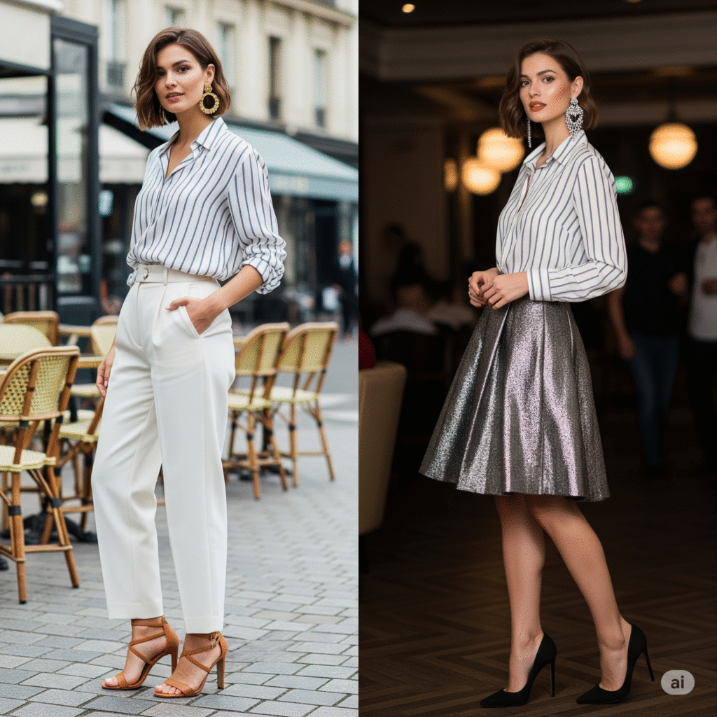 - Look Chic e Confortável: Combine uma blusa listrada de seda ou de um tecido mais fino com uma calça pantacourt de cor lisa. Sandálias de salto fino e brincos statement transformam o visual.