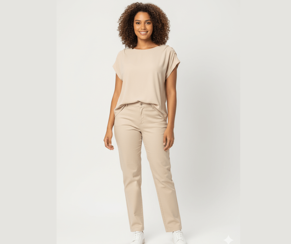 Calça reta de sarja + manga japonesa em tecido leve = look equilibrado e confortável.