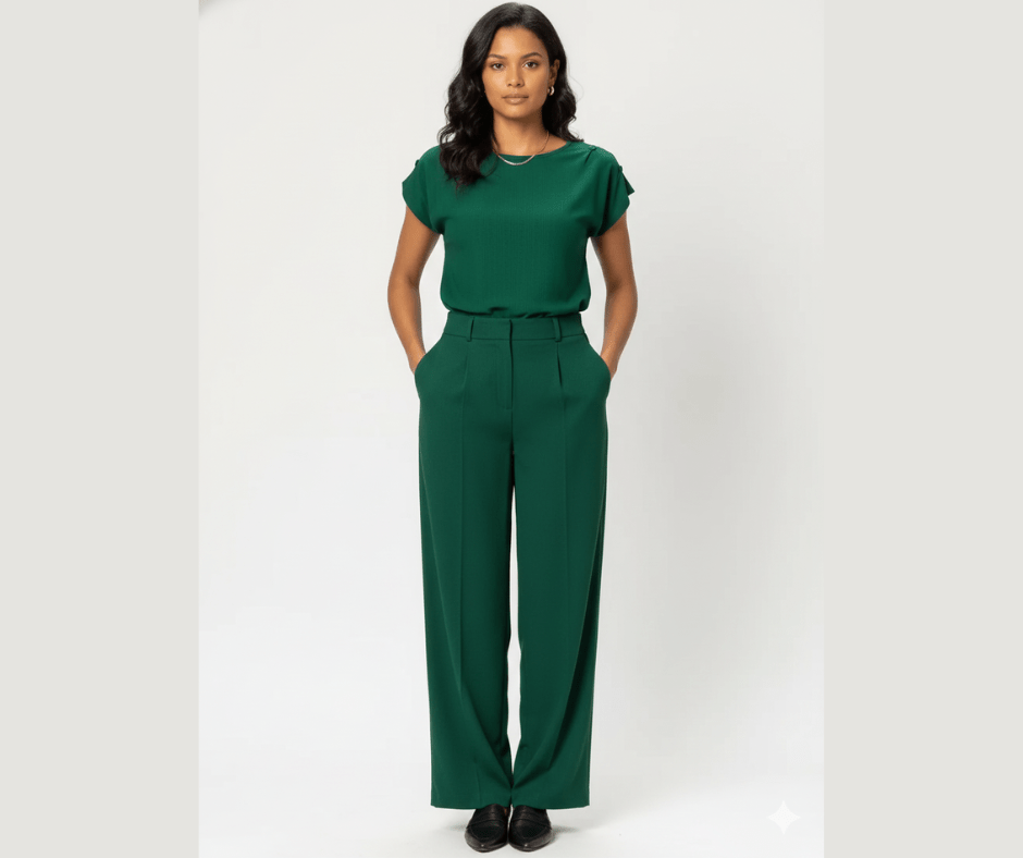 Calça wide alfaiataria em tecido estruturado + manga japonesa em crepe ou linho premium = elegância moderna.