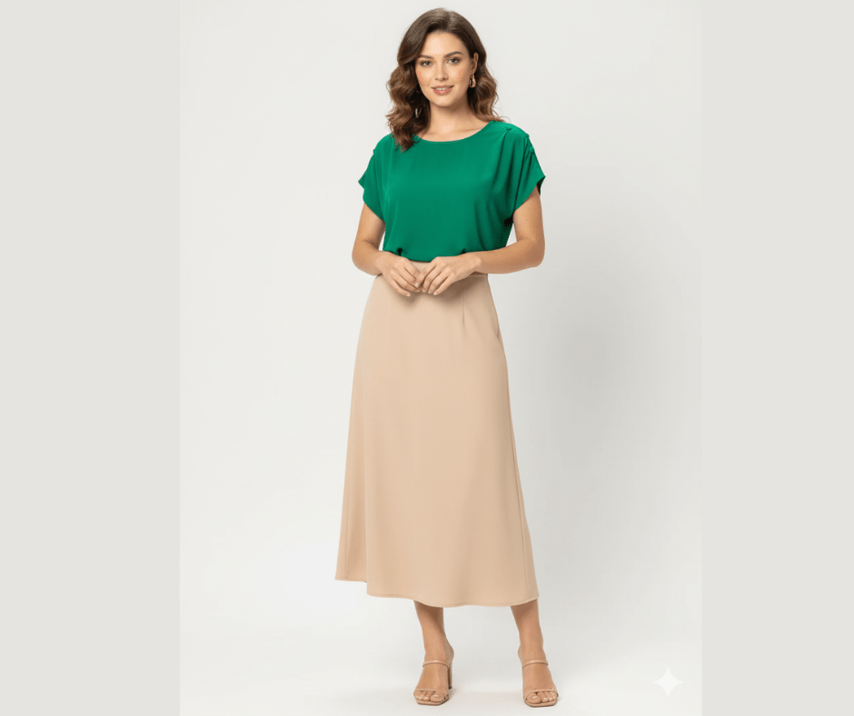 Saia midi reta ou evasê suave + blusa manga japonesa = feminino equilibrado e chique.