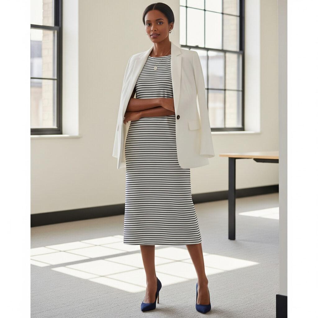 - Para o ambiente de trabalho ou compromissos mais formais: prefira modelos com estampas discretas, listras finas ou detalhes náuticos sutis. O corte reto ou levemente acinturado ajuda a transmitir profissionalismo e elegância, sem perder o toque marítimo. Você pode compor com um blazer e sapatos fechados para reforçar a formalidade.